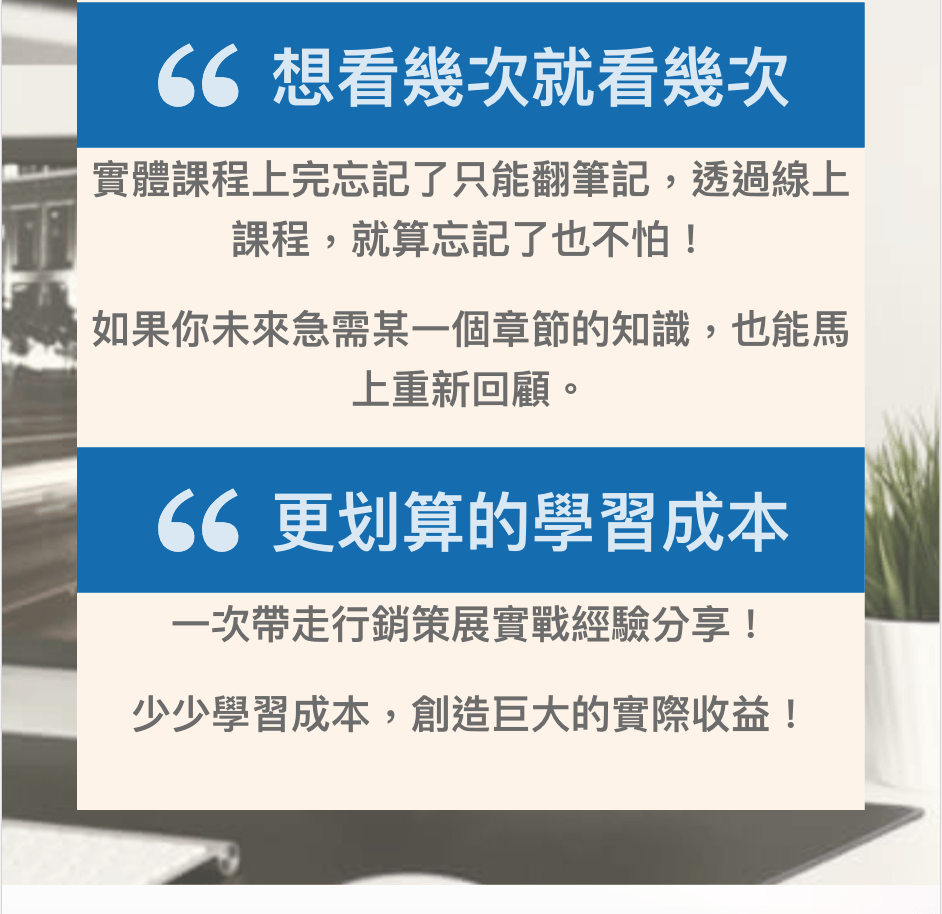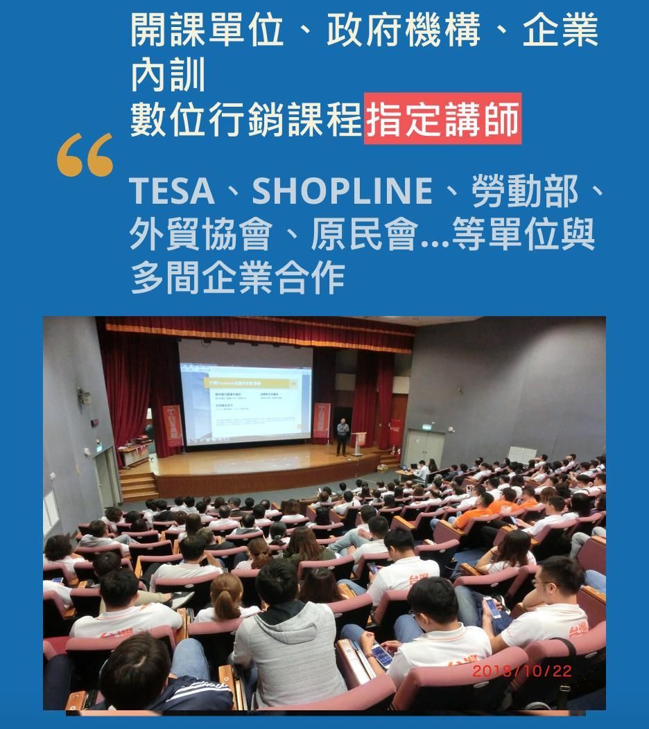 作為一名電商講師,全台已經培育超過 3,000 位電商菁英、1,000 名 Facebook 廣告投手,能以最淺顯易懂的方式帶你了解、活用數位行銷工具,並搭配行銷策展的規劃,協助每個顧客業績成長。