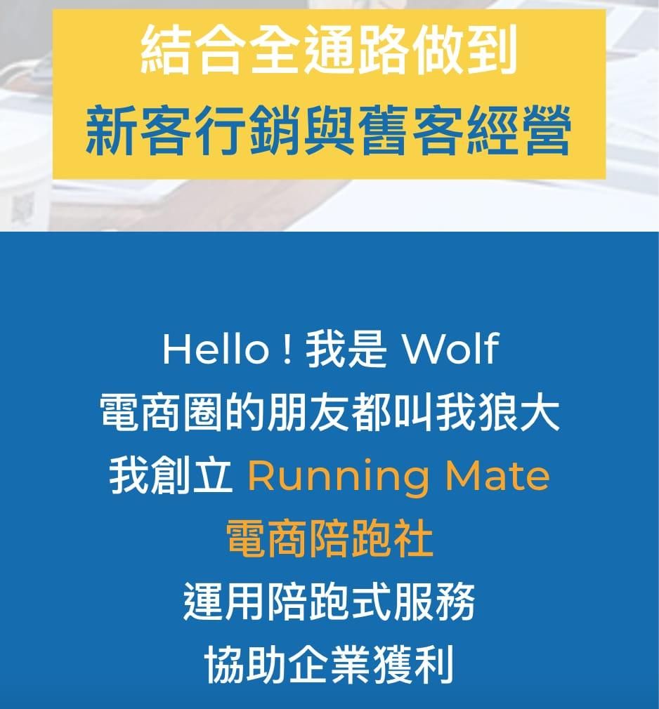 是狼大,也可以叫我 Wolf ,我深耕電商、數位行銷領域超過 10 年,也創造出自己一套知識體系在市場進行分享。
