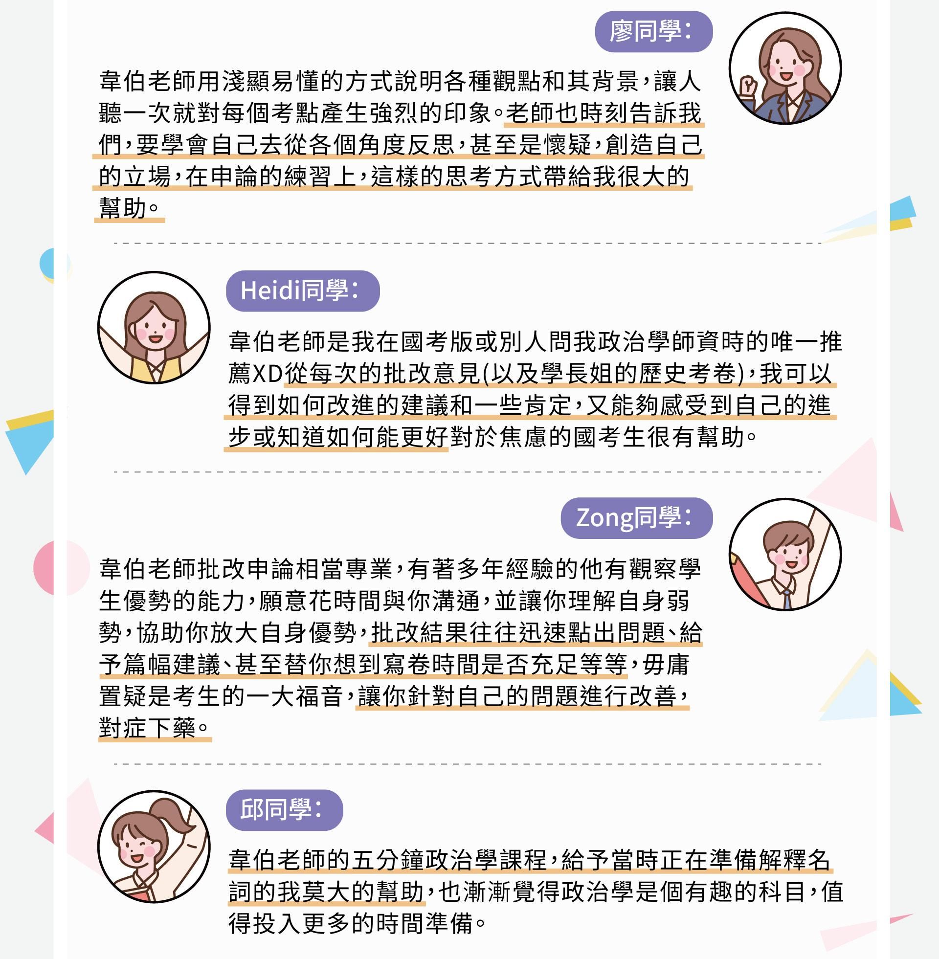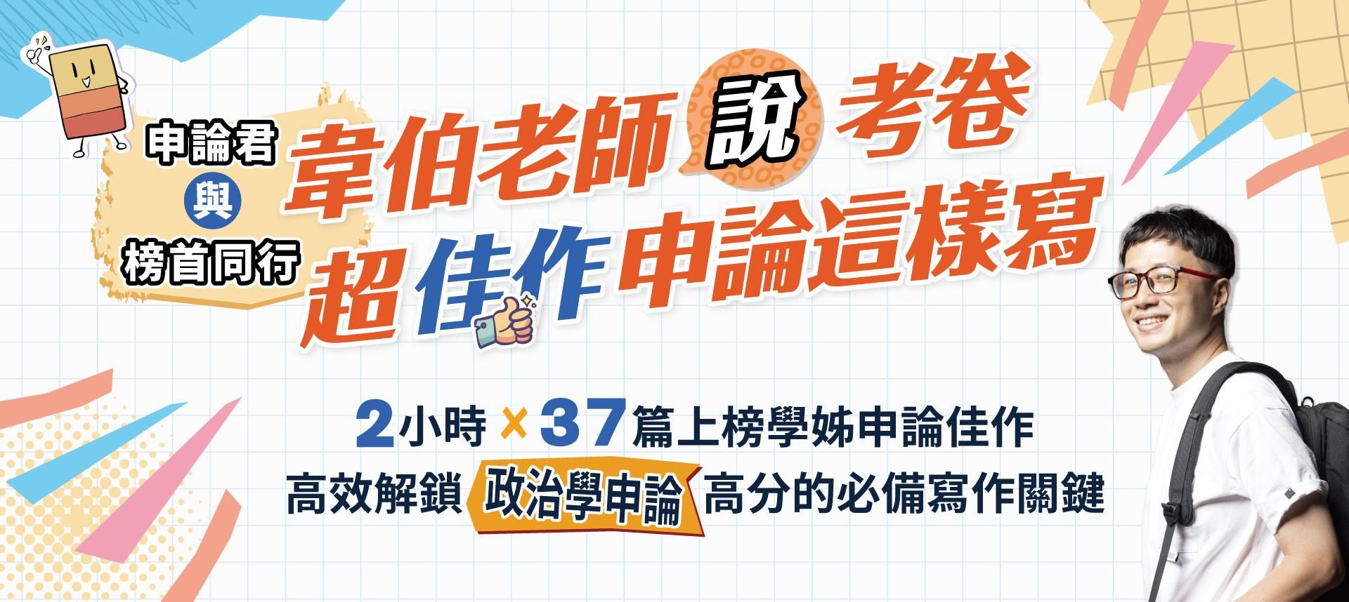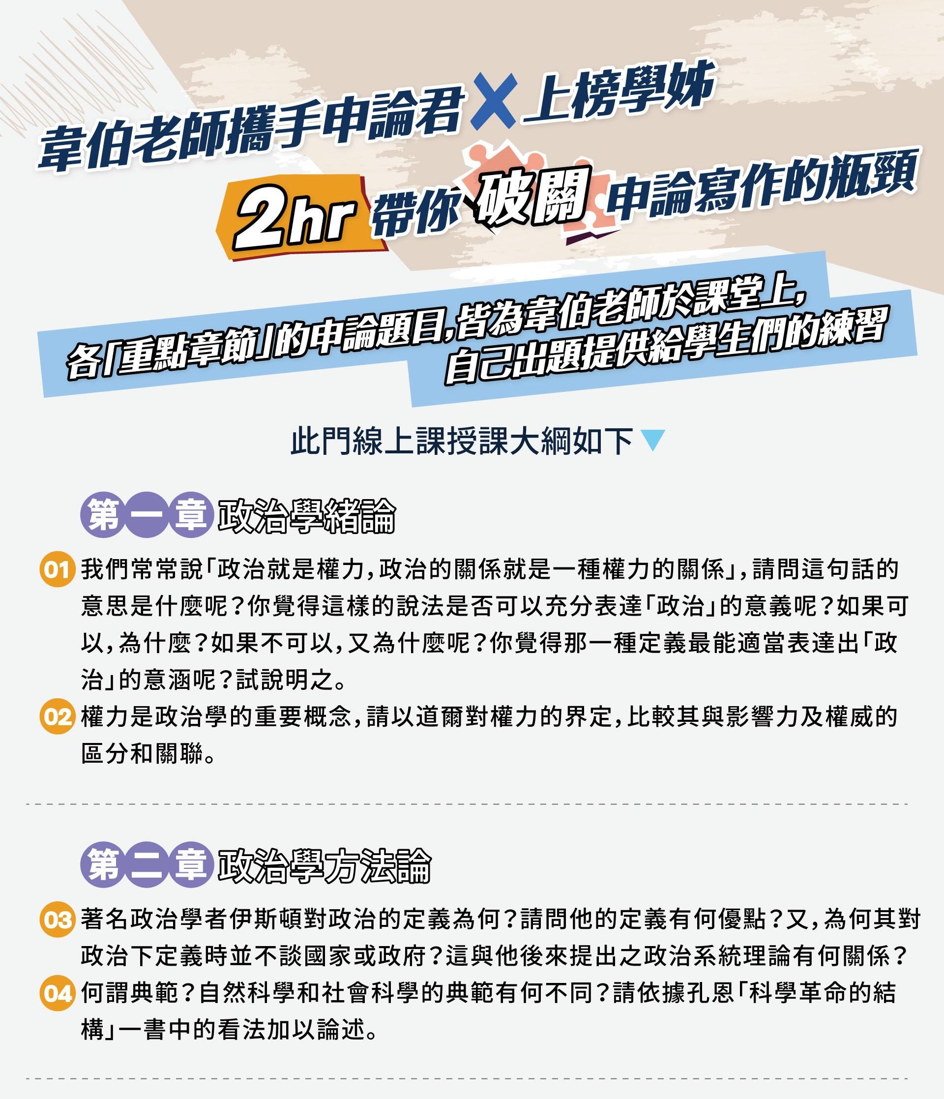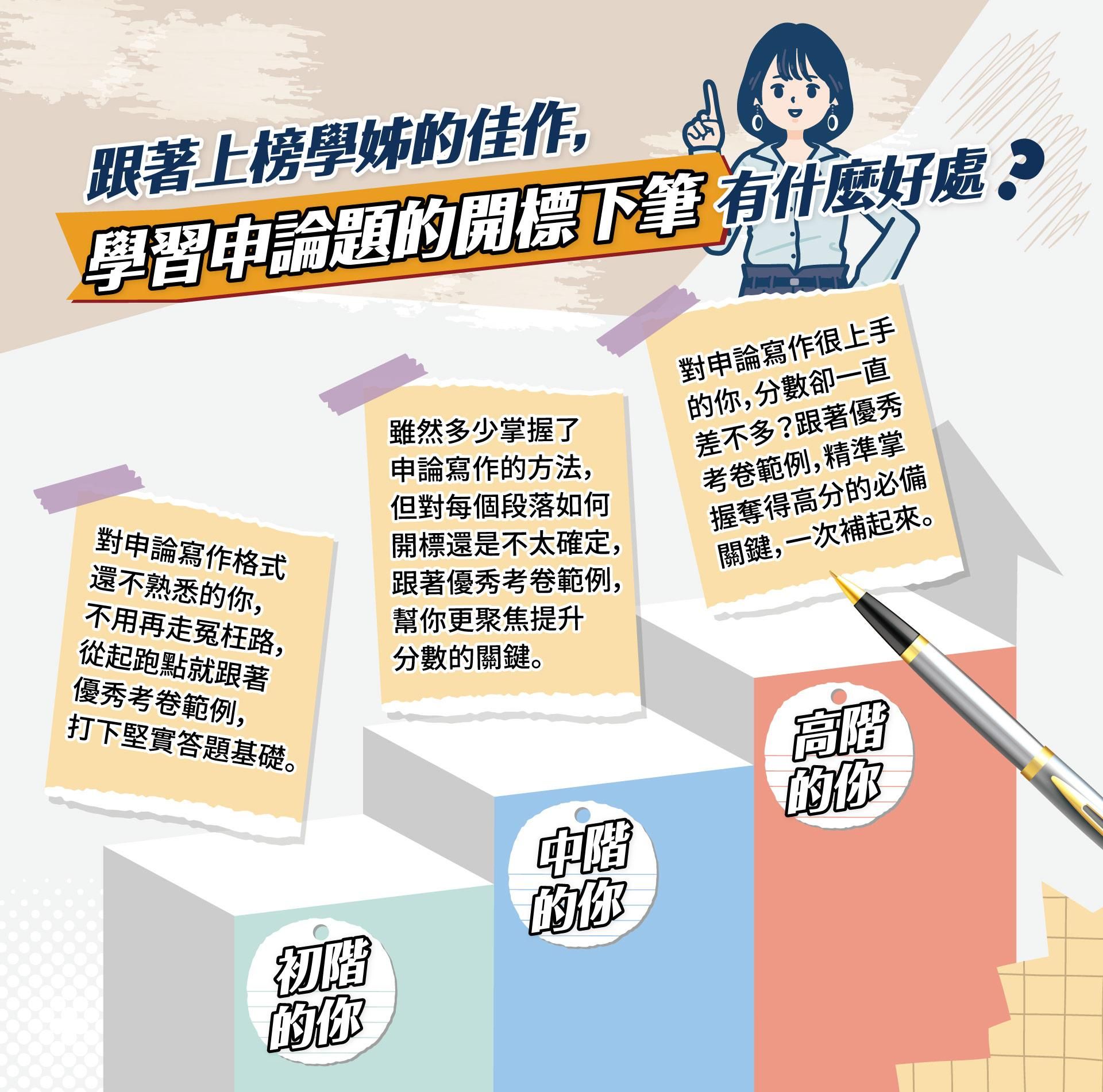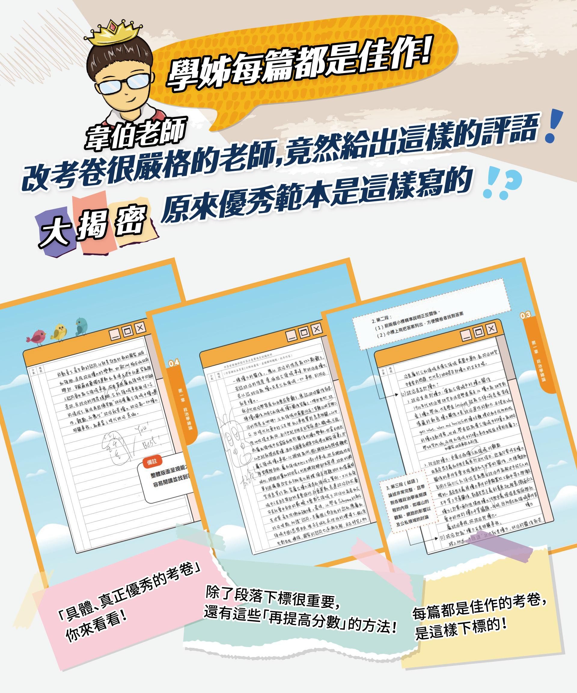 |課程特色| 1.面對這麼多的練習考題、考古題,雖然韋伯老師上課都有提到寫作方向,但具體真正優秀的考卷將會如何呈現。 2.透過學姊非常優秀的考卷,讓買課同學可以知道每個段落如何開標題,以及奪得高分的必備關鍵。