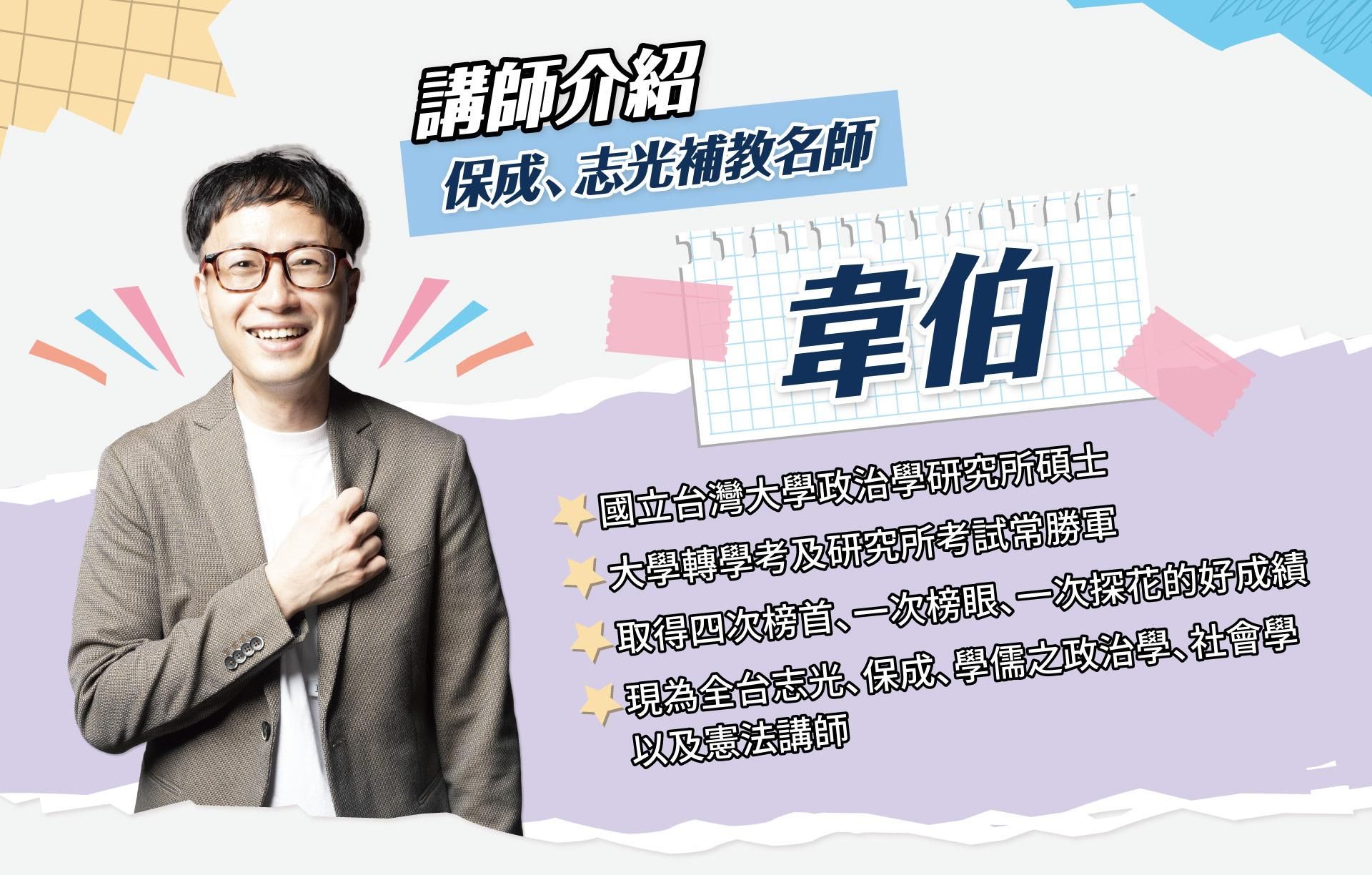 |講師介紹| 韋伯 榜首製造機 政治大學政治系、台灣大學政治學研究所畢業(榜首入學) 曾轉戰各大政治學考試,並取得四次榜首一次榜眼一次探花的好成績。將近十年轉學考、研究所以及國家考試等政治學相關科目授課經驗,獨創政治學學習之「拆解式理解法」,曾成功輔導多位高普考政治學同學創下「單題滿分」以及「高分錄取」之紀錄。 律師高考及格