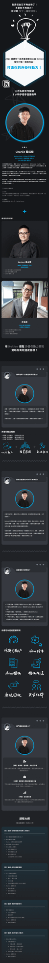 除此之外, Charlie 擅長洞悉使用情境,幫助企業用 Notion,打造專屬數位管理流程,像是檸檬知識創新、知識獲利大聯盟、椪一下麻辣…等企業,降低管理的時間與金錢成本,讓問題高效解決,把時間花在更有產出的事情上。