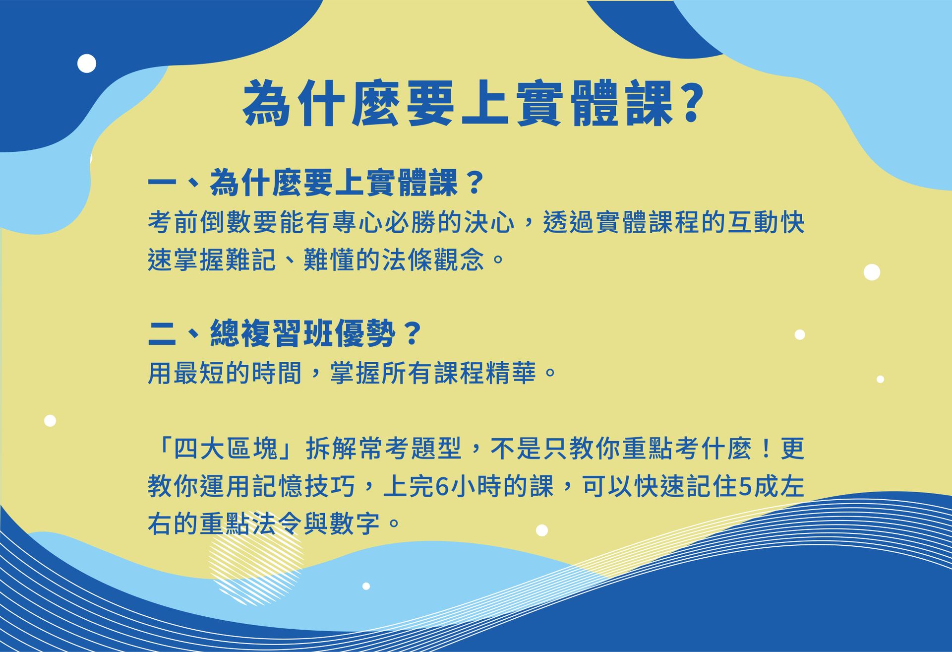 無論你準備了多久,有一堂讓你用最短的時間,重新掌握所有考試精華的衝刺班,絕對值得你報名。我會分四大區塊拆解常考題型,不是只教你重點考什麼,更教你運用記憶技巧,上完6小時的課,可以快速記住5成左右的重點法令與數字。